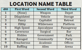 - A set of tables for generating completely valid and narratively consistent location names like "Treacherous Government Bar" and "High-Speed Surgical Arena"