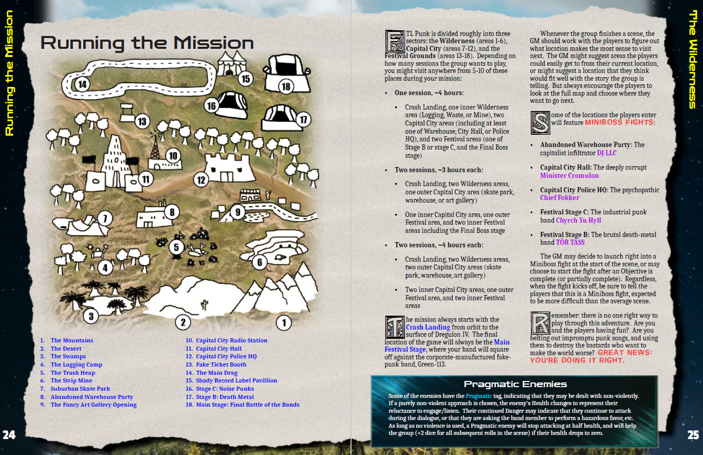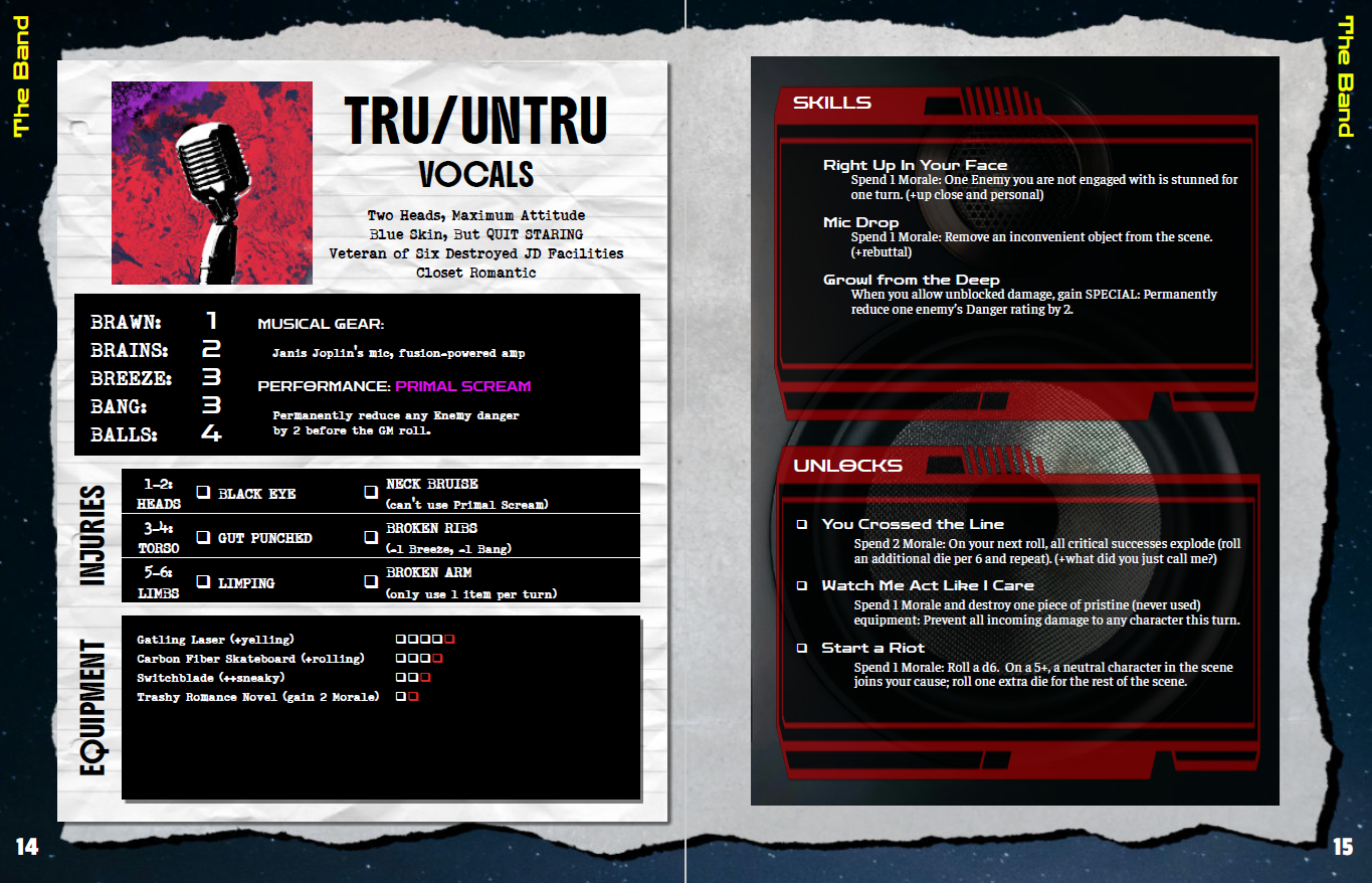 This game features everything you'll need to run up to five players through a ridiculous, action-packed story about punk rock, community, and resistance: