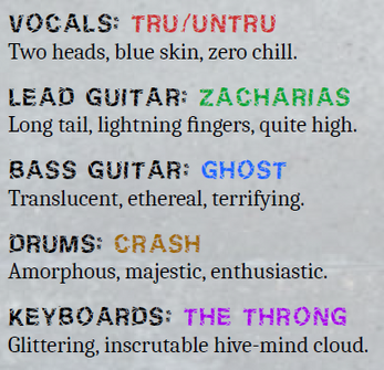 - Five pre-generated characters for band members with unique personalities, specialized gear and abilities, and unlockable special upgrades